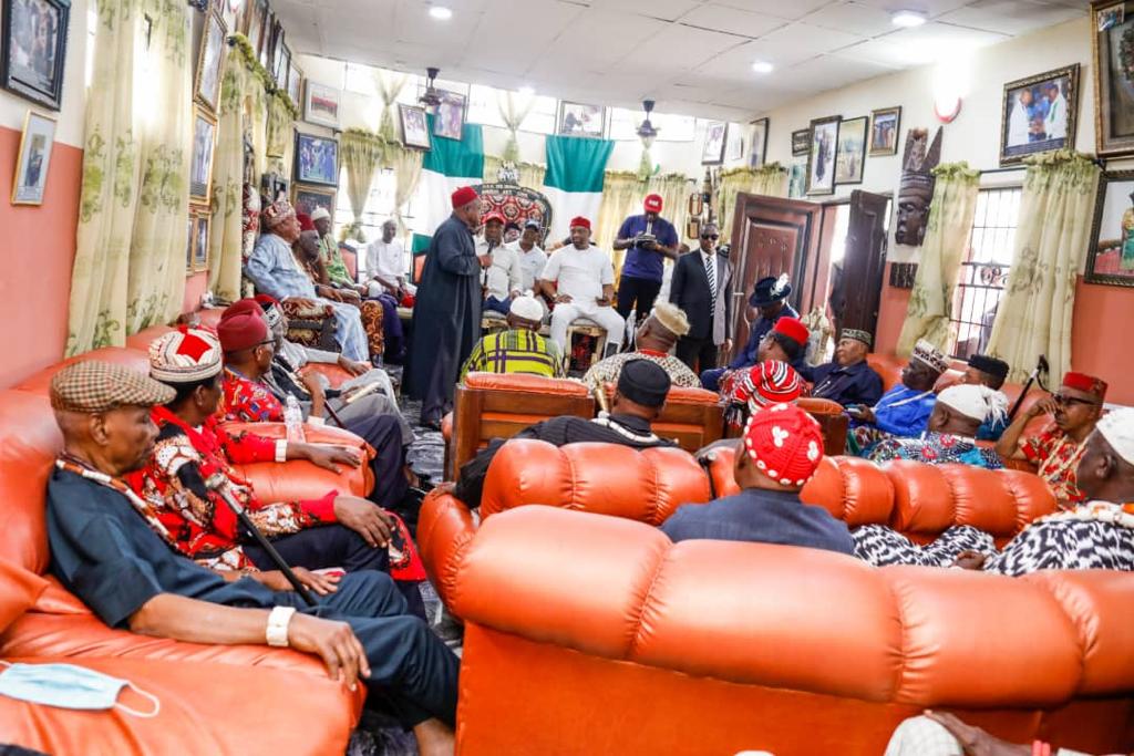 Chief Whip of the Senate, Senator Orji Uzor Kalu is currently being hosted by the Royal Traditional leaders of Bende Local Government ik continuation of his Mid-Term Constituency report tour. Kalu and his entourage are being hosted at the Royal Palace of Eze Uwakwe O. Ukaegbu, Ofufe II of Amaofufe Autonomous community, Item, Igbere. Eze Uwakwe who doubles as Chairman of Bende Traditional rulers Council hosted Orji Kalu amongst other Traditional rulers of the community.